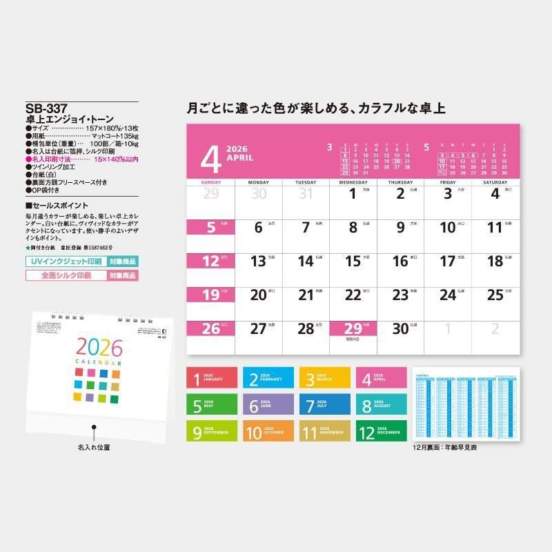 • 毎月違うカラーが楽しめる、楽しい卓上カレンダー。 白い台紙に、ヴィヴィッドなカラーがアクセントになっています。 使い勝手のよいデザインもポイント。