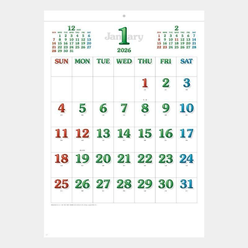 • 立体的な表情をCGでシャープに表現したオリジナル書体が強いインパクト。 十分なメモスペースと前後月、六曜表記で実用性抜群。